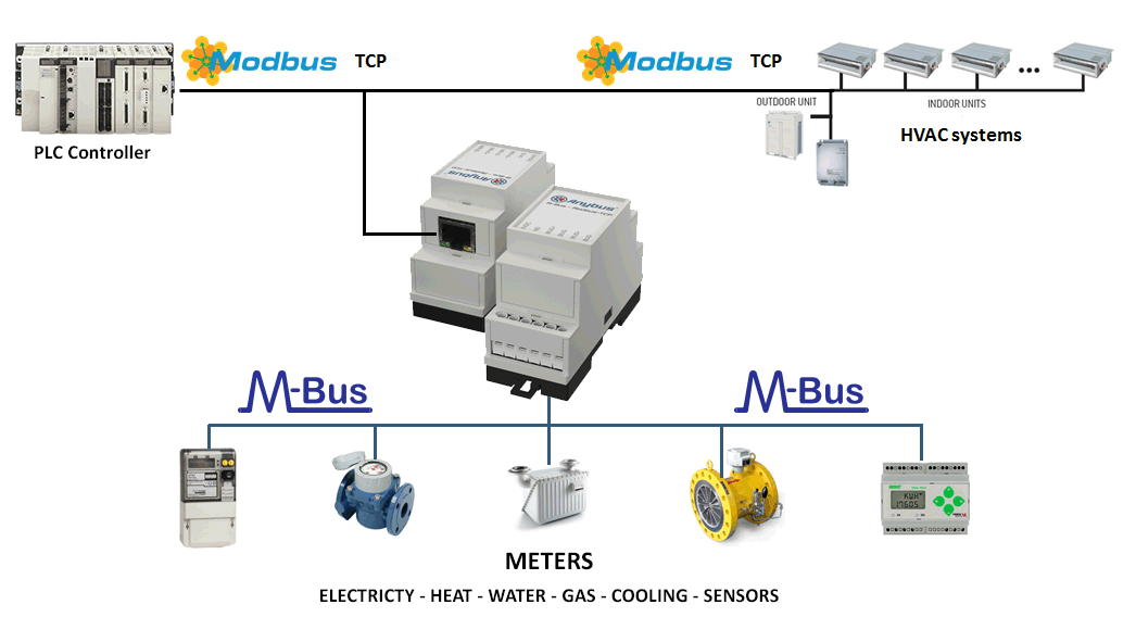 The Anybus M-Bus to Modbus TCP gateway allows M-Bus devices to communicate on a Modbus TCP network. The gateway decodes M-Bus telegrams making it possible to map meter values to Modbus registers. This enables central control and supervision of measuring devices which usually use the M-Bus protocol.