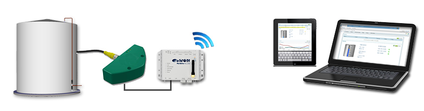Netbiter Gateway kết nối với cảm biến mức bồn nhiên liệu bằng cổng Serial (RS-485) hoặc bằng tín hiệu 4-20mA, Ethernet hoặc I/O. Gateway gửi thông tin qua Internet hoặc mạng di động (GSM / GPRS / 3G 4G) đến trung tâm dữ liệu Netbiter Argos Cloud.