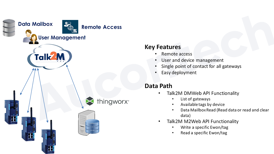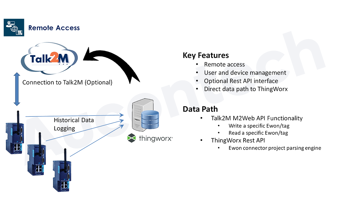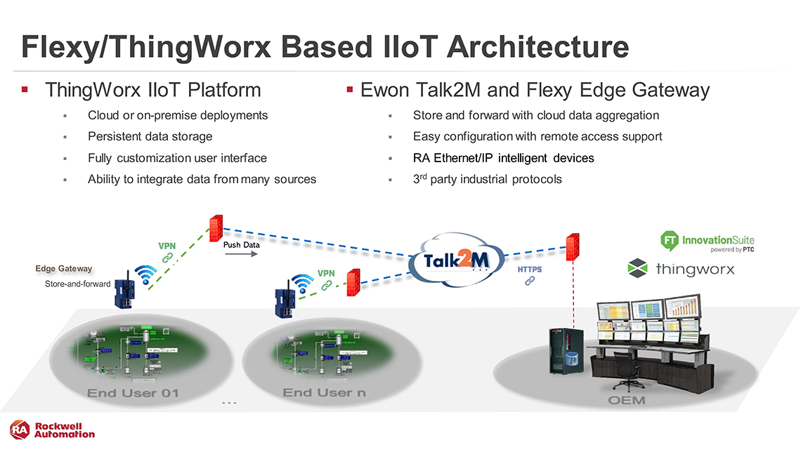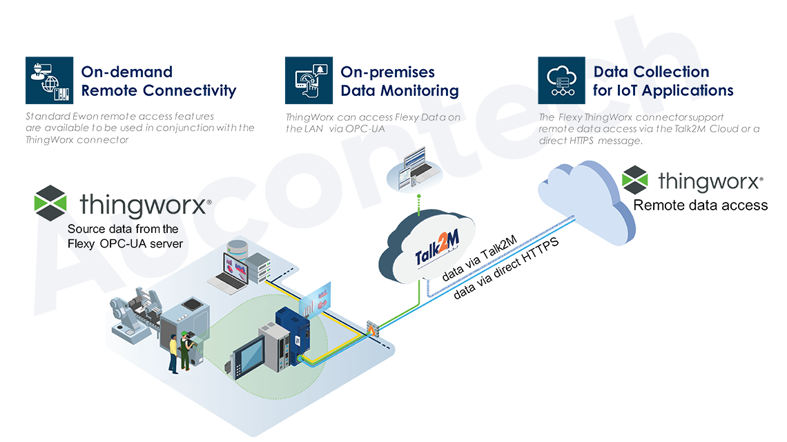 Kết nối dữ liệu từ xa tới máy chủ nội bộ - Giải pháp tận dụng Ewon Talk2M Cloud để dễ dàng thu thập dữ liệu từ nhiều Flexy gateway từ xa. | Kết nối dữ liệu từ xa tới máy chủ đám mây - Giải pháp này thúc đẩy một ứng dụng chạy trên Flexy để đẩy dữ liệu trực tiếp đến Cloud bằng ThingWorx RESTful API. |