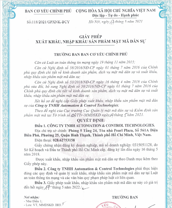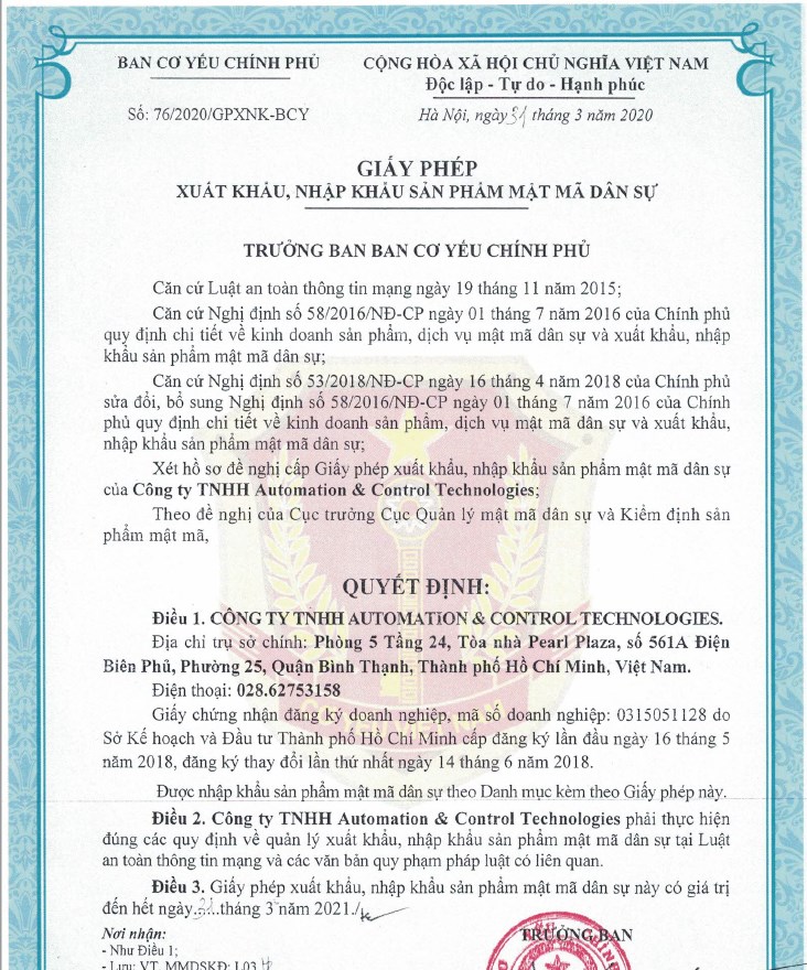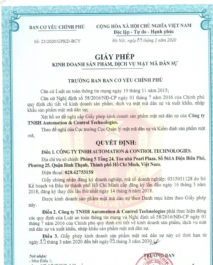 Giấy phép kinh doanh sản phẩm, dịch vụ Mật Mã Dân Sự và Giấy phép Xuất Nhập Khẩu sản phầm Mật Mã Dân sự theo Nghị định 53/2018/NĐ-CP sửa đổi Nghị định 58/2016/NĐ-CP về KD sản phẩm, dịch vụ mật mã dân sự và xuất khẩu, nhập khẩu sản phẩm mật mã dân sự do Ban Cơ yếu Chính phủ cấp.