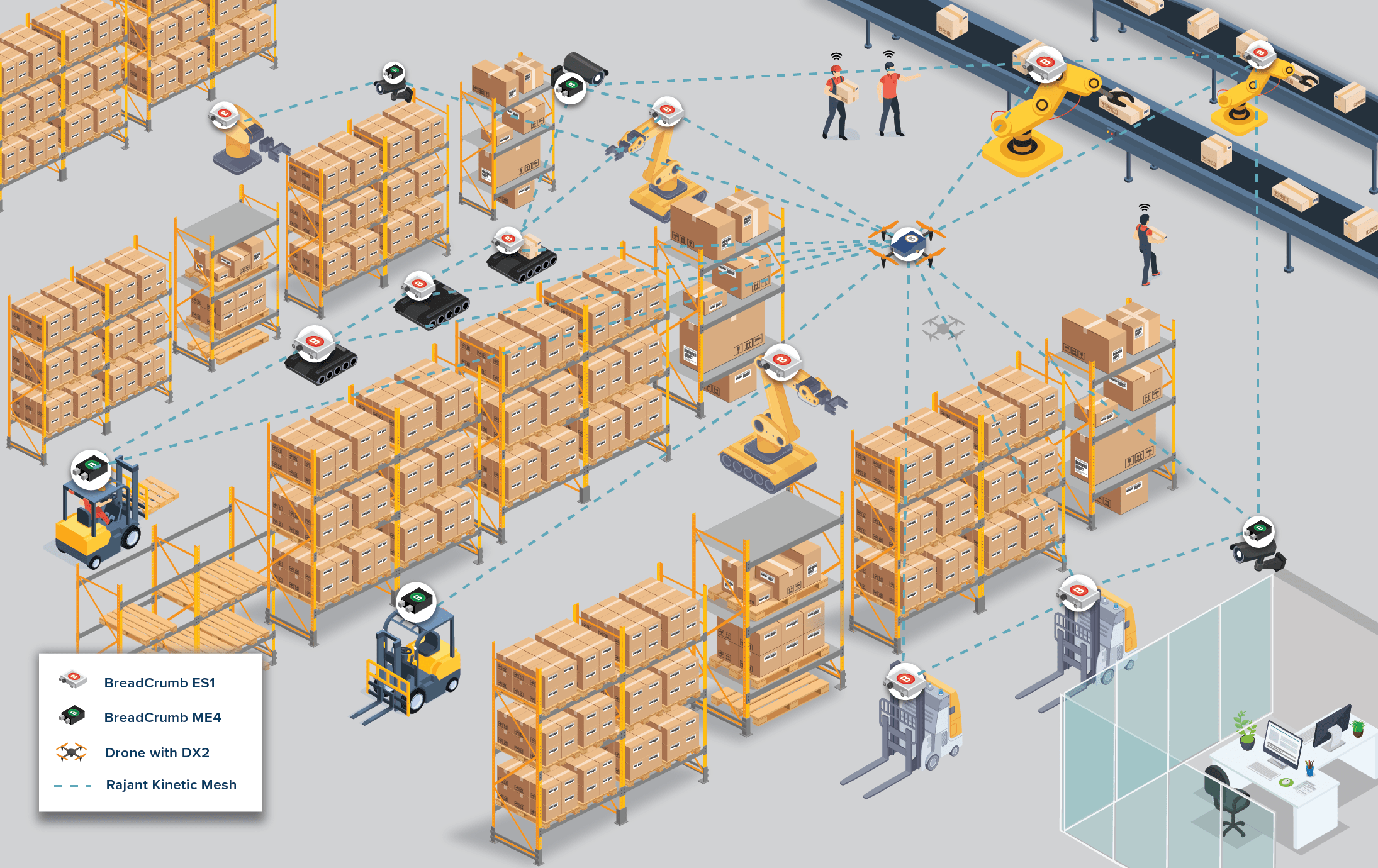 Đã qua rồi cái thời hoạt động tĩnh và cơ sở hạ tầng mạng cố định. Ngày nay, máy móc công nghiệp trong nhà máy với khả năng tự hành và được điều khiển từ xa yêu cầu việc kết nối không dây 'không bao giờ được gián đoạn', nhưng giá đỡ và thiết bị kim loại trong xưởng có thể chặn tín hiệu RF (Nguồn tín hiệu vô tuyến điện) và khiến các hệ thống tự động hóa này ngừng hoạt động. Rajant BreadCrumbs, với tính năng chứa nhiều kết nối trên nhiều tần số cùng một lúc, có thể dễ dàng được đặt ở những nơi cần thiết để xử lý các vật cản. Các nút nhỏ gọn, nhẹ này thậm chí có thể được triển khai trên robot, thiết bị và nhân viên làm việc xen kẽ giữa các giá đỡ để dễ dàng mở rộng phạm vi phủ sóng ở những khu vực khó kết nối mạng nhất.
