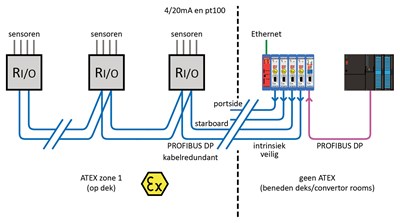 Dự phòng cáp cũng là một yêu cầu cụ thể, vì các tàu chở dầu thường gặp điều kiện thời tiết khắc nghiệt làm tăng khả năng cáp PROFIBUS bị đứt và thời gian ngừng hoạt động sau đó. Herman lưu ý: “Đó là lý do tại sao chúng tôi nhấn mạnh vào việc lắp đặt dự phòng tất cả các cáp PROFIBUS. Bằng cách này, tất cả dữ liệu từ tủ I/O từ xa được truyền đến phòng chuyển đổi một cách an toàn và đồng thời. Bằng cách sử dụng dự phòng cáp, một cài đặt đáng tin cậy được tạo ra và nguy cơ thời gian ngừng hoạt động giảm đáng kể”.