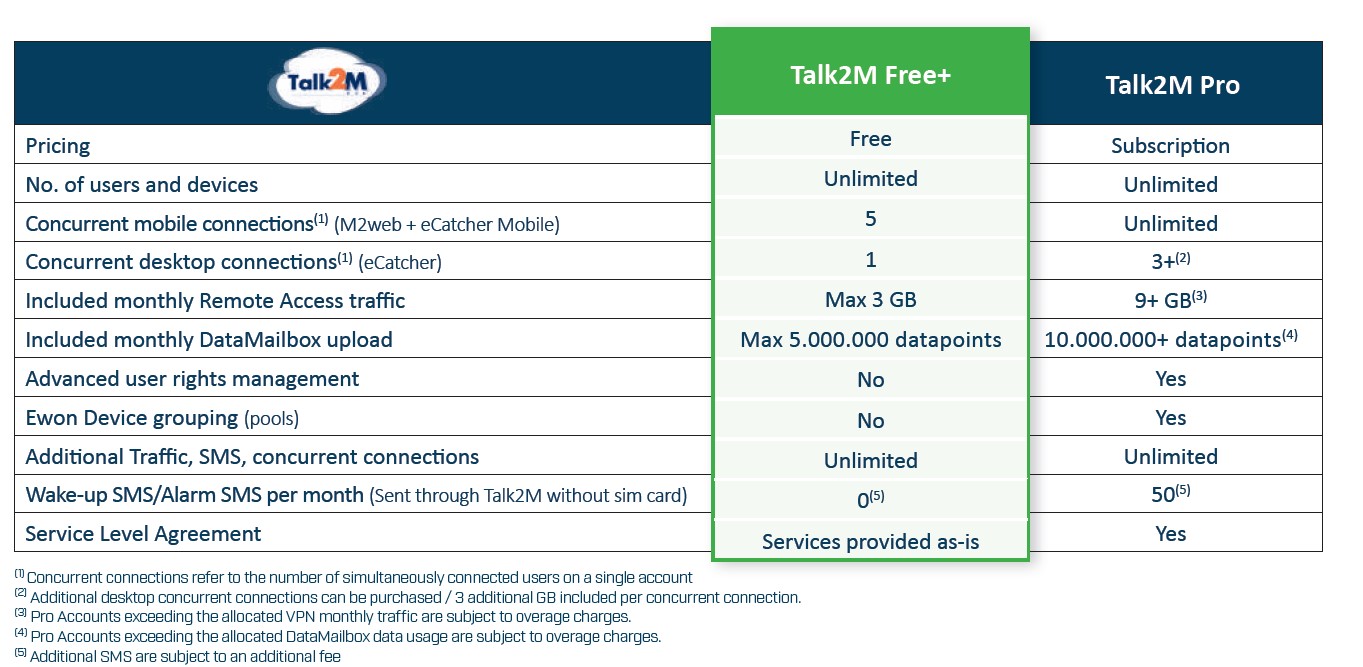 The Talk2M Pro plan covers the needs of the most typical applications for machine builders, system integrators and OEMs. Nevertheless, if for some reasons you need additional concurrent connections, data traffic or SMS messages, you can order an additional yearly fee package that includes 1 additional concurrent connection with 2 GB data traffic (Part Number: TM50042).