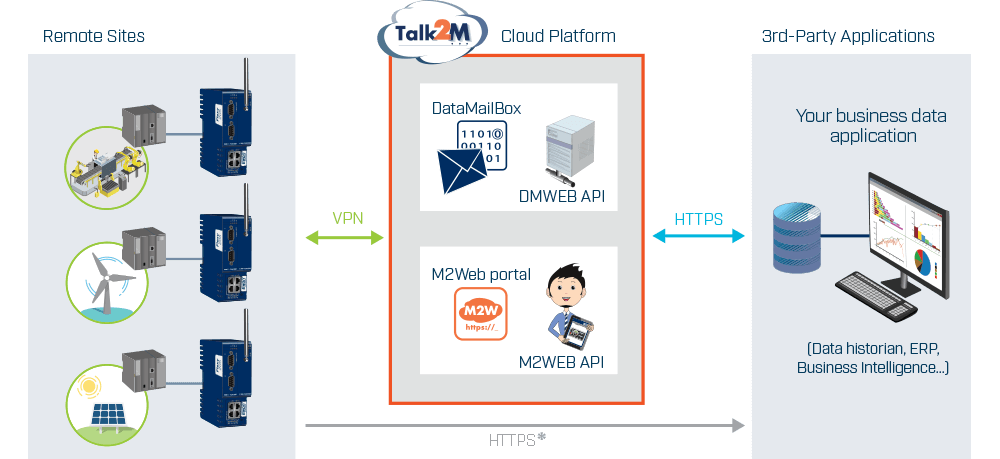 Kể từ năm 2006, dịch vụ Talk2M độc đáo đáp ứng mong đợi của các Nhà chế tạo máy, Người tích hợp hệ thống và OEM muốn truy cập máy của họ từ xa một cách dễ dàng và an toàn. Trong những năm qua, Talk2M đã trở thành không chỉ là một đám mây để truy cập từ xa vào máy móc - nó đã phát triển thành một liên kết cơ bản trong chuỗi giá trị IoT công nghiệp. Các nhóm phần mềm cũng tận dụng nền tảng Talk2M để truy xuất dữ liệu từ hiện trường một cách an toàn, phát triển các ứng dụng làm tăng giá trị cho dữ liệu. Với các dịch vụ hoạt động được xác định rõ ràng để quản lý tài khoản và thiết bị, Talk2M là lựa chọn tốt nhất cho giải pháp từ xa của bạn.
